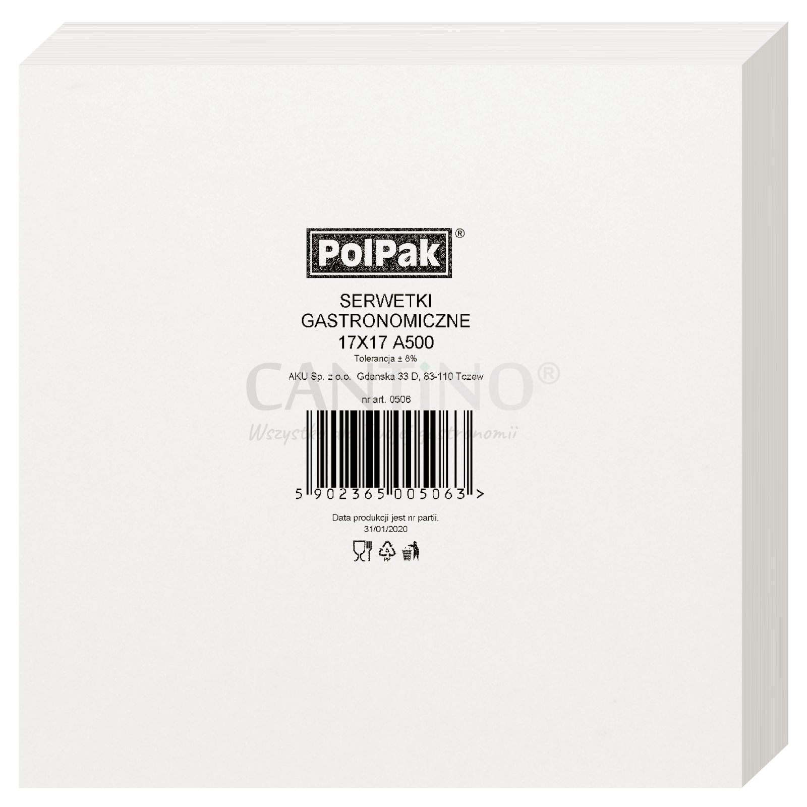 Biała serwetka jednowarstwowa o wymiarach 17 x 17 cm.