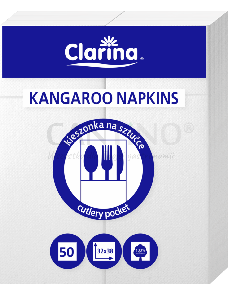 Dwuwarstwowa serwetka z kieszonką tzw. kangurek, w kolorze białym o wymiarach 32 cm x 38 cm (po rozłożeniu).