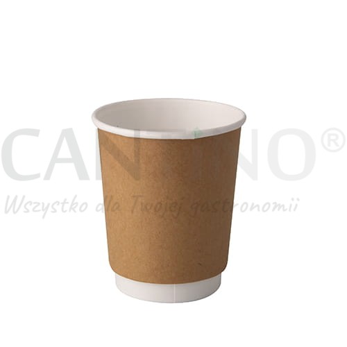 Dwuwarstwowy kubek papierowy o pojemności 250 ml, średnicy 80 mm oraz wysokości 90 mm w kolorze brązowym.