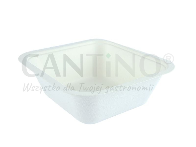 Pojemnik z trzciny cukrowej o pojemności 1000 ml oraz wymiarach 19,5 x 18 x 6,5 cm w naturalnym, białym kolorze.