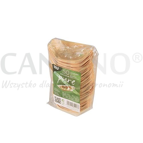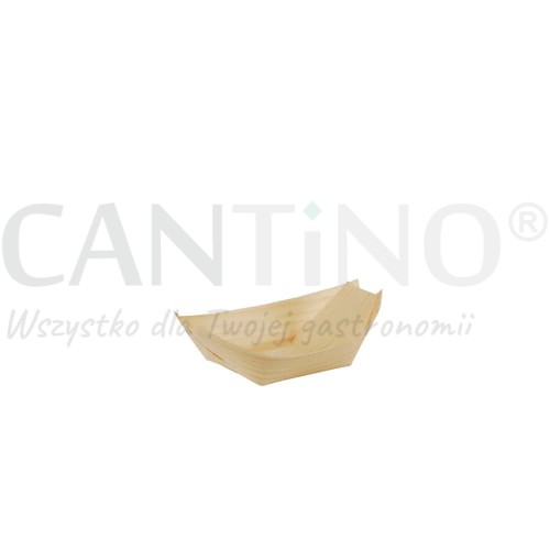Drewniana miseczka w kształcie łódki o wymiarach 85 x 55 mm w naturalnym, brązowym kolorze.