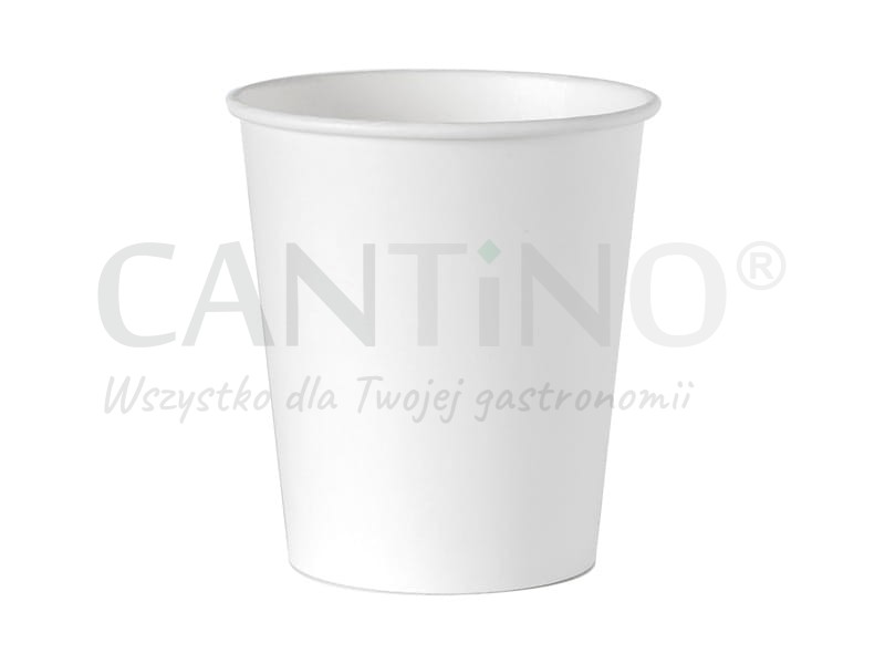 Kubek papierowy w kolorze białym o pojemności 180 ml i średnicy 70 mm.