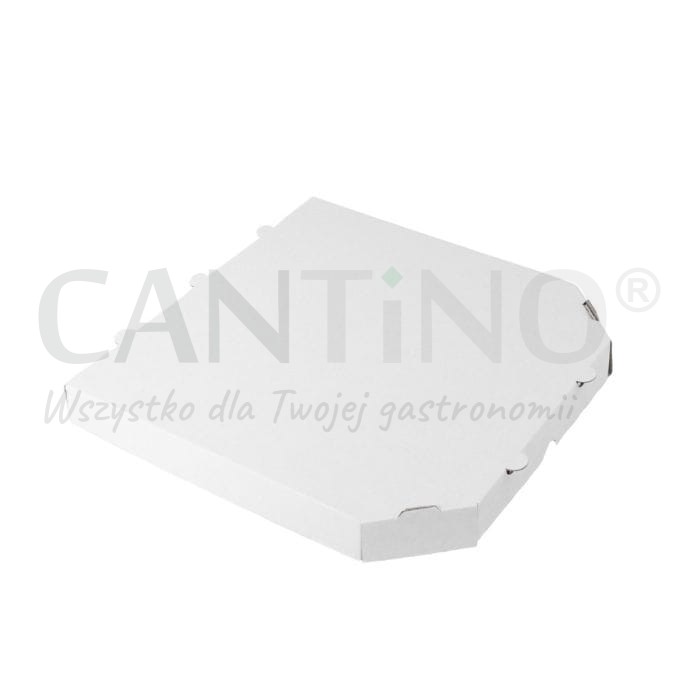 Białe opakowanie na pizzę o średnicy 28 cm w kształcie kwadratu, ze ściętymi rogami.
