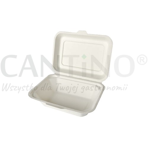Opakowanie z trzciny cukrowej o wymiarach 18 x 12,5 x 6 cm, z wbudowaną pokrywką.