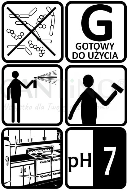 rozprowadzić preparat na powierzchni przy pomocy spryskiwacza. Preparat wykazuje działanie bakteriobójcze i grzybobójcze w czasie 3 minut, w temp. 20°C.