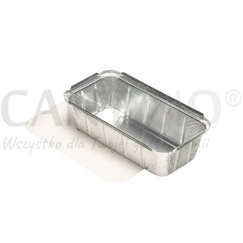 Aluminiowy pojemnik z pokrywką z tektury o wymiarach 21,3x11x5,4 cm i pojemności 1000 ml.