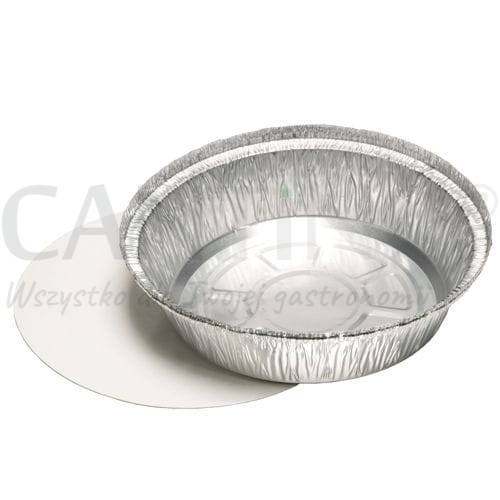 Aluminiowy, okrągły pojemnik z pokrywką z tektury o średnicy 18,2 cm, wysokości 4 cm i pojemności 770 ml.