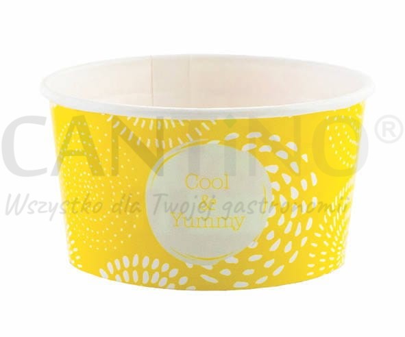 Papierowy pojemnik na lody z nadrukiem o pojemności 140 ml i średnicy 80 mm, w kolorze żółtym.