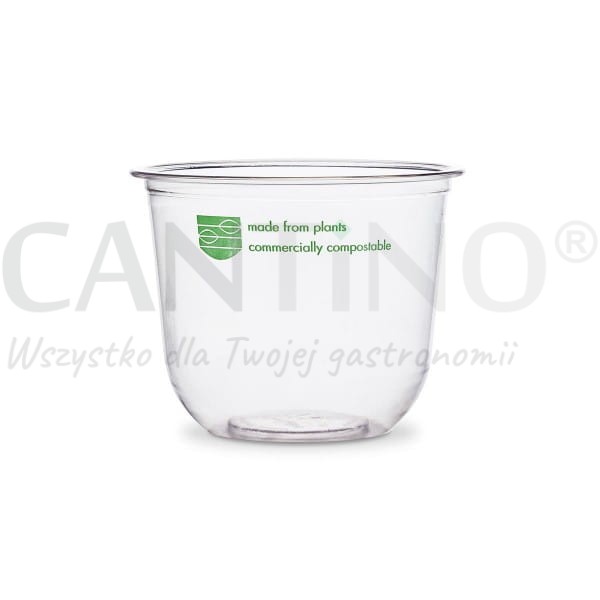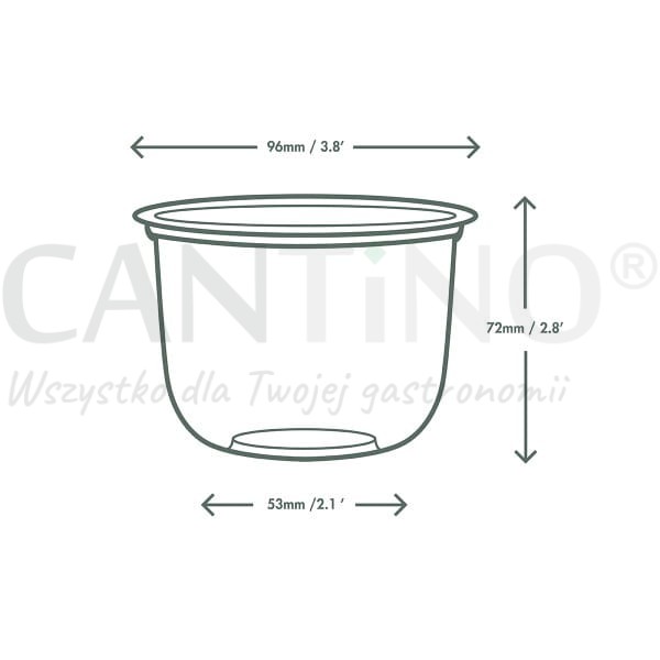 Transparentny, okrągły pojemnik z PLA o pojemności 350 ml, wysokości 72 mm i średnicy 96mm.