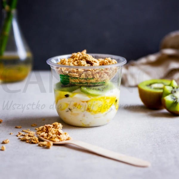 Wykonany z PLA (mączka kukurydziana), materiału pochodzenia roślinnego. Jest w 100% kompostowalny i stanowi doskonałą alternatywę dla tradycyjnych tworzyw sztucznych. Odporny na uszkodzenia, co pozwala na bezpieczny transport dań. Charakteryzuje się wytrzymałością na temperatury nawet do 40°C, przeznaczony głównie do zimnych potraw.