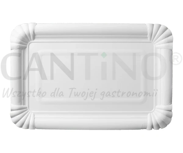 Ekologiczna, prostokątna tacka papierowa o wymiarach 20 × 13 cm, w kolorze białym.