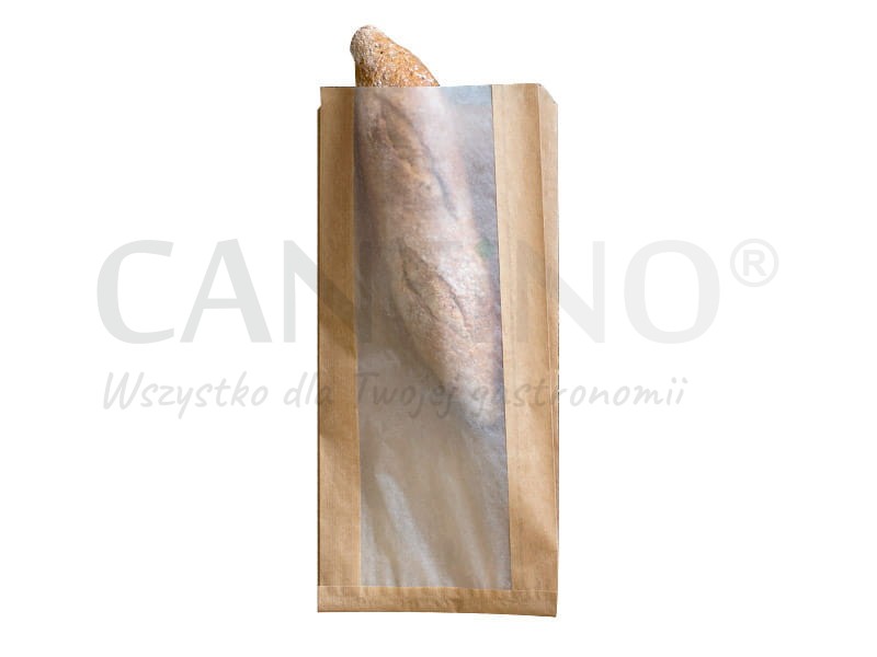 Papierowa torebka fałdowa z okienkiem o wymiarach 16x8x35 cm w naturalnym, brązowym kolorze.